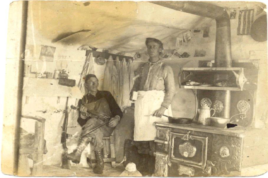 | Elmer playing his fiddle outside his first home (1907) | Elmer inside his home with friend Ole Rostvit (1907) |