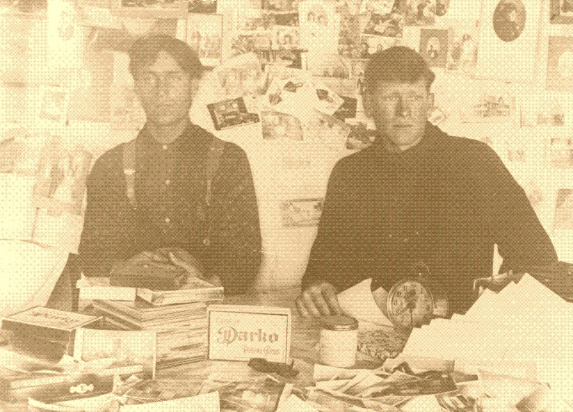 | Elmer and Oscar building Elmer's home (1908) | Elmer and Oscar surrounded by Oscar's many photographs (1908) |